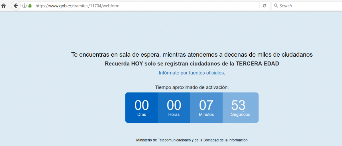 El Gobierno de Ecuador abrió el lunes el proceso de inscripción para mayores de 65 años en una plataforma diseñada para tal efecto, pero el mismo día colapsó. Según el Gobierno, desde el martes la plataforma funciona con normalidad.